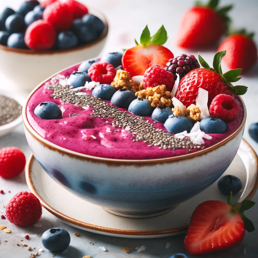 토핑: 그래놀라, 신선한 베리, 치아씨드, 코코넛 플레이크